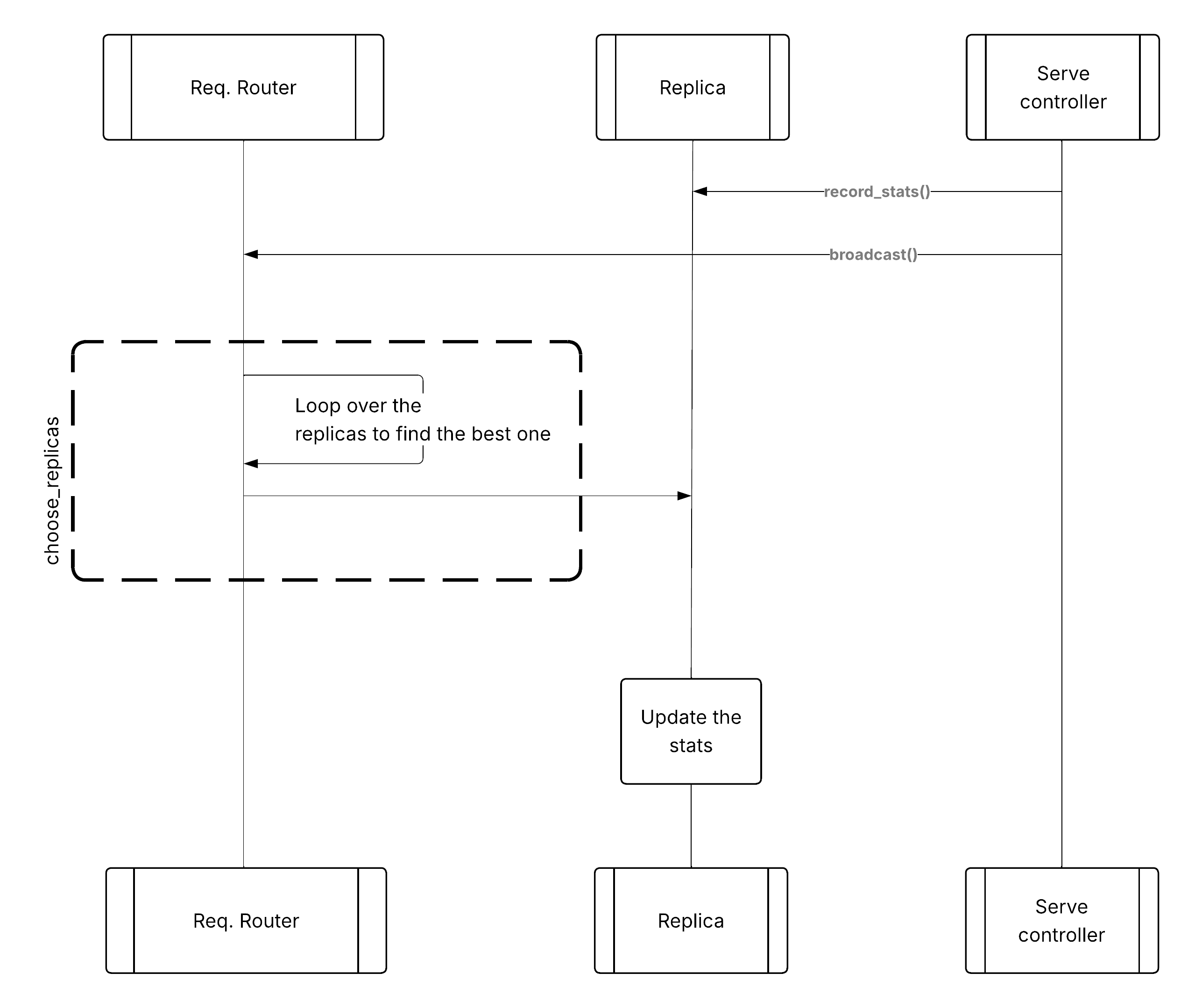 In this approach, the Serve controller polls each replica for local statistics and then broadcasts them to all request routers on their deployment handles. The request router can then use this globally broadcasted information to pick the right replica. After a request reaches the replica, the replica updates its local statistics so it can send them back to the Serve controller when the controller polls it next time.