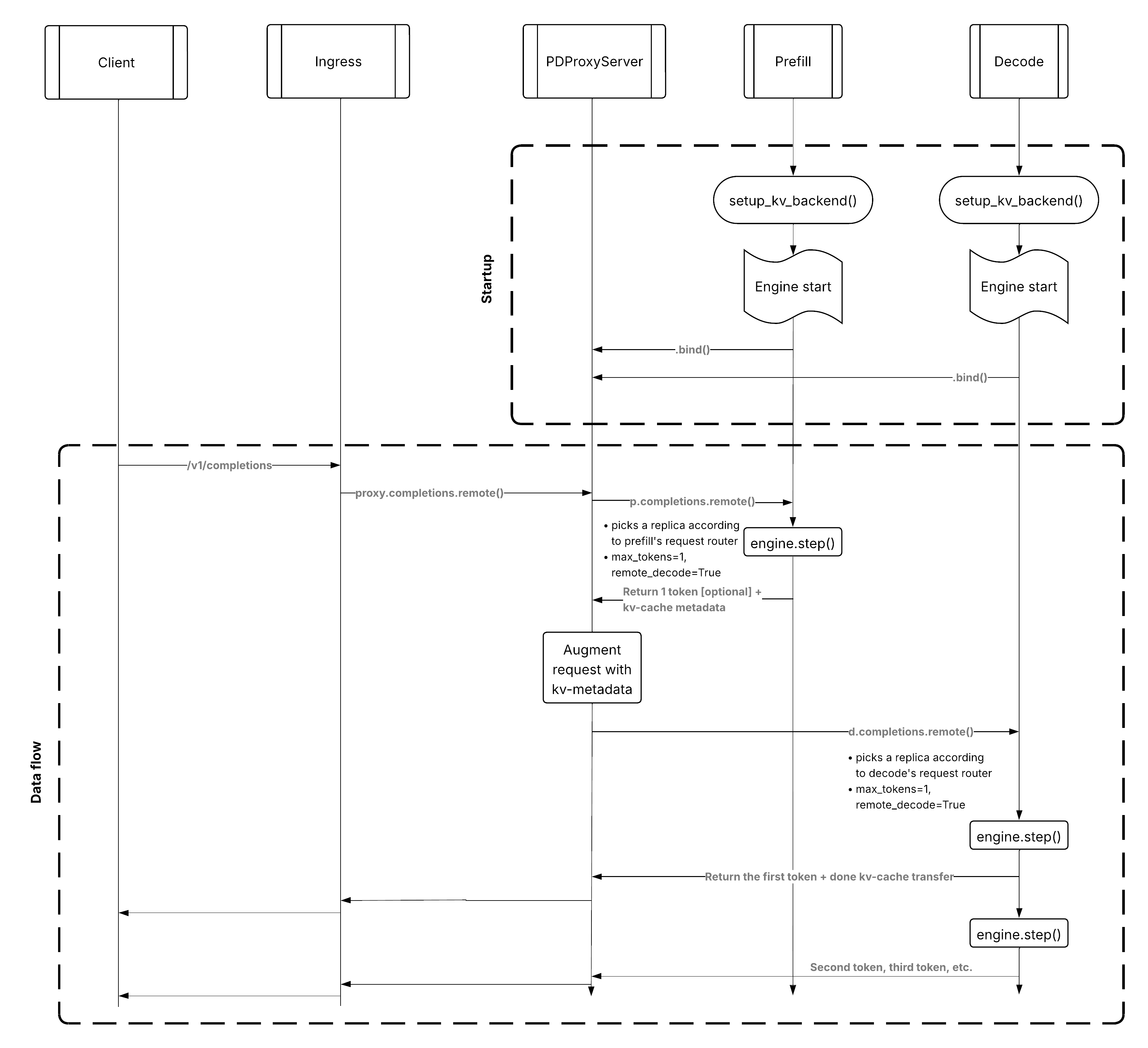 PDProxyServercalls decode deployment with KV metadata.Decode server loads KV cache from storage.