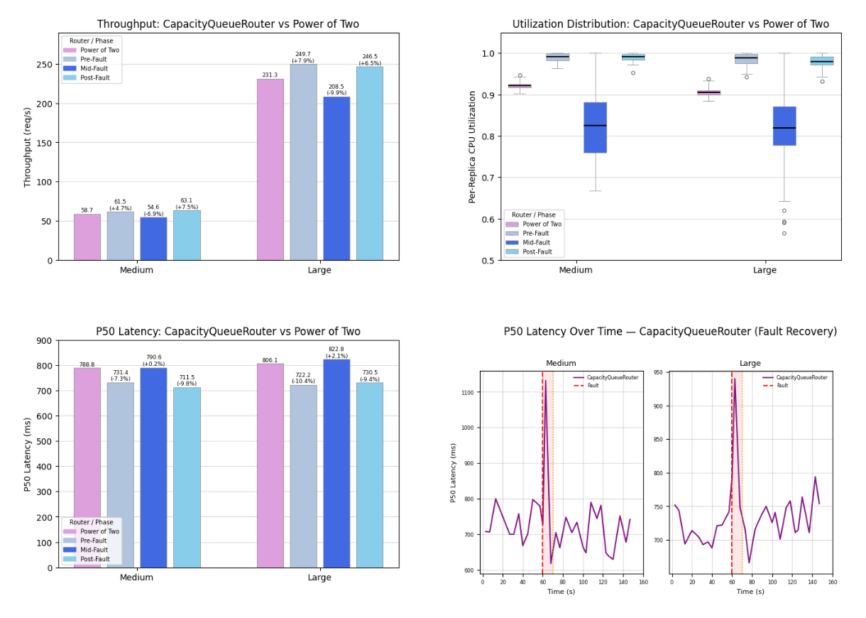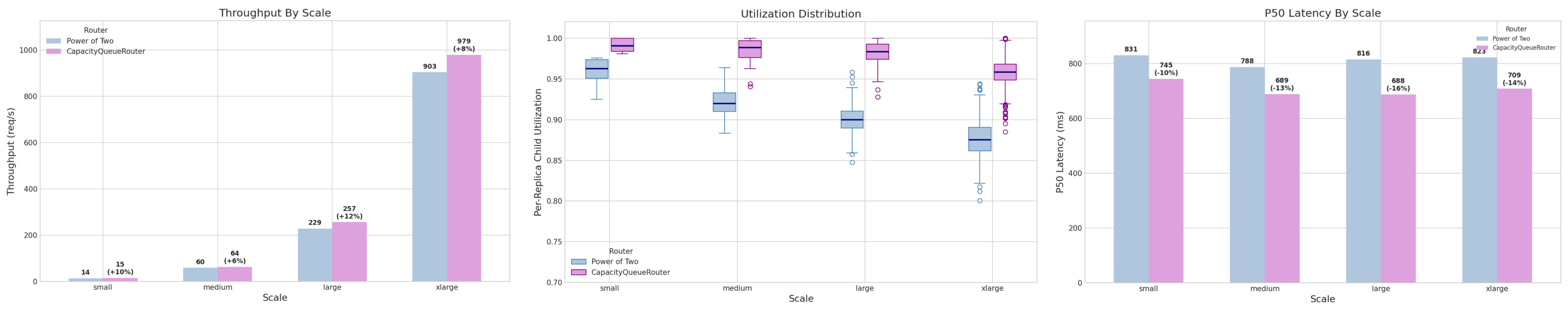 Under normal (success) situations, CapacityQueueRouter yields higher throughput and utilization and lower latency.